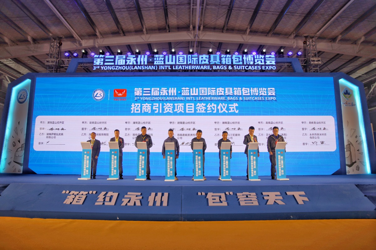 3月24日上午,第三屆永州·藍山國際皮具箱包博覽會在湖南省永州市藍山縣皮具箱包科技產業園創品國際智慧物流園拉開帷幕。本屆博覽會以“‘箱’約永州、‘包’容天下”為主題,現場簽約招商引資項目14個,總投資金額13億元,現場簽訂外貿訂單8單,簽約金額3.5億元人民幣。