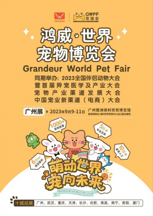 2023年9月9日-11日,廣州保利世貿(mào)博覽館,10萬+愛寵人士和5萬+采購(gòu)商都會(huì)來的鴻威?世界寵物博覽會(huì)(GWPF世寵會(huì)),熱忱期待您的加入,和我們一起見證國(guó)內(nèi)寵業(yè)品牌的誕生與成長(zhǎng),多城聯(lián)動(dòng),商貿(mào)交流,對(duì)話全球,加速國(guó)際化戰(zhàn)略進(jìn)程,共筑引領(lǐng)世界風(fēng)向的寵業(yè)新標(biāo)桿!